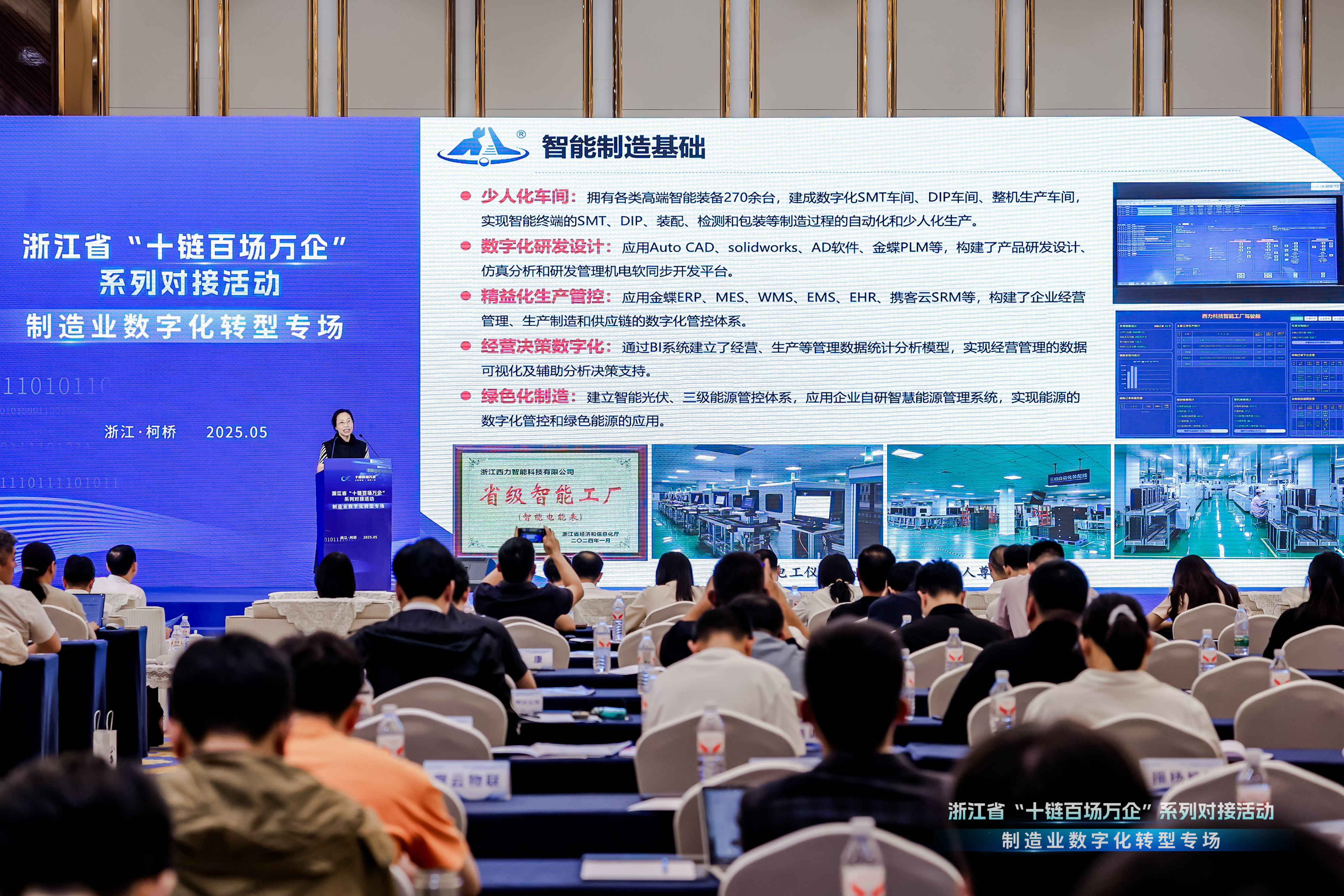 5 月 28 日,由浙江省經濟和信息化廳主辦的“十鏈百場萬企”系列對接活動之制造業數字化轉型專場在紹興市柯橋區舉行。公司受邀參會并總經理周小蕾在會上發表了《西力智能能源計量終端未來工廠試點情況介紹及AI需求發布》的主題演講,向與會領導、專家介紹了西力科技在數字化轉型方面的探索與實踐。
