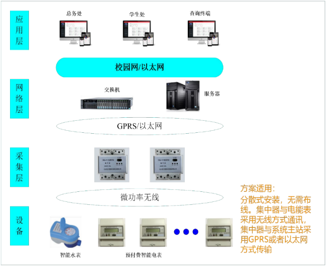 (2)無線組網方案:無線組網方案不依賴于校園網絡,電能表與集中器采用微功率無線自組網方式通訊,遠傳網絡采用GPRS公網或以太網,實現遠程預付費、負荷控制和抄表等功能;施工方便,智能設備全部采用無線方式通訊,無需布線;無線網絡安全性更高,避免人為破壞線路導致通訊問題。